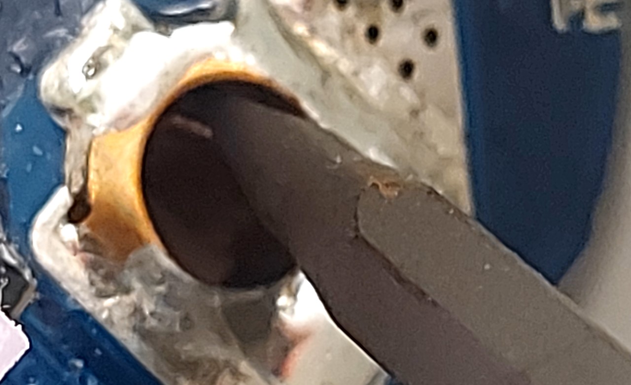 I de synliga hålen på kretskortet finns kontaktblecken. Använd en liten skruvmejsel eller ett gem för att försiktigt trycka ihop blecken. Viktigt: Innan du testar med en kontakt, se till att återmontera locket. Annars kan kontakten riskera att fastna.