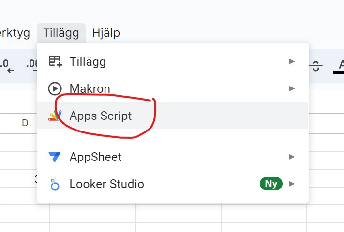 För att starta skripthanteraren klickar du på menyn "Tillägg" och väljer "Apps Script". Då får du upp skripthanteraren med ett skript som innehåller en tom funktion.