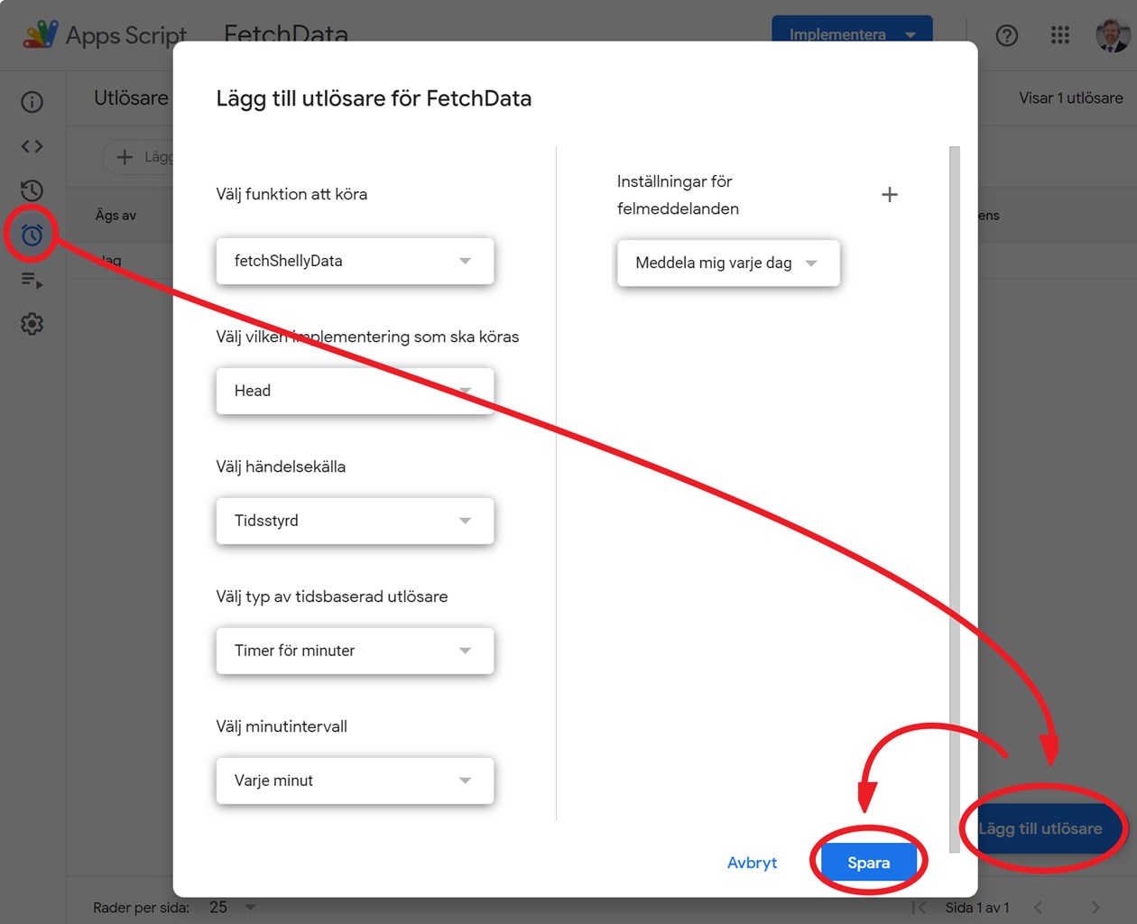 För att skriptet ska logga informationen regelbundet måste du skapa en "utlösare". Välj klockan till vänster och lägg sedan till en utlösare som anropar funktionen varje minut. Den måste anropas varje minut även om loggningen sker för varje timme för att få den så noggrann som möjligt.