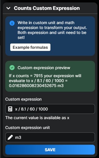 För att få fram förbrukat volym måste man även ta hänsyn till att frekvensen och kalibreringskonstanten har olika tidsaspekter, sek och min. Det betyder att antalet pulser måste divideras med kalibreringskonstanten samt 60 för att få fram volymen i liter. Vill man ha volymen i m3 (kubikmeter) måste man dividera dem med 1000 också.