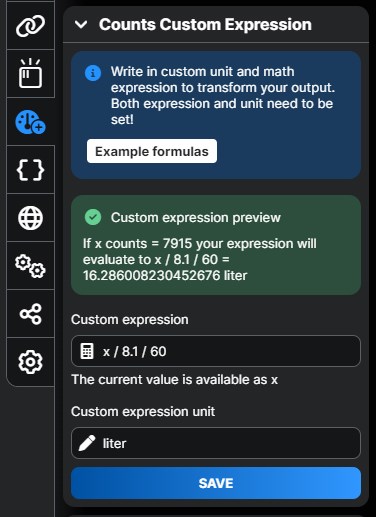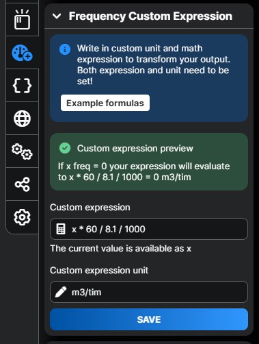 Här är 4 stycken bilder som visar hur Shelly Plus UNI ska konfigureras för att visa rätt värden i antingen liter eller m3.