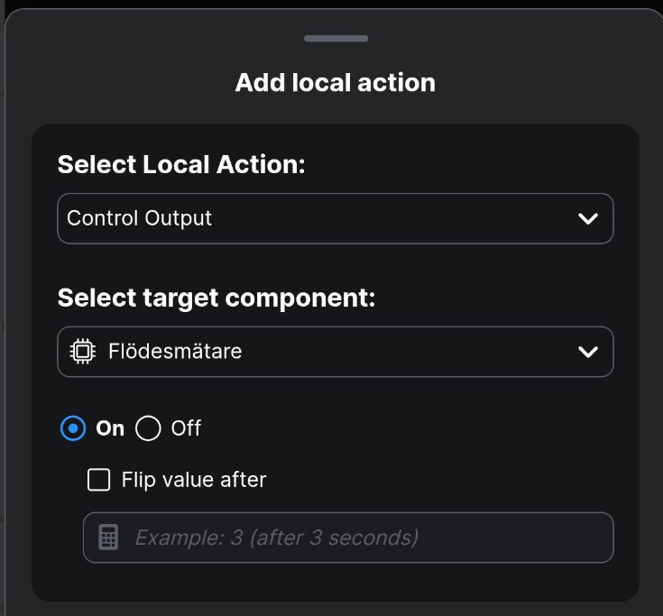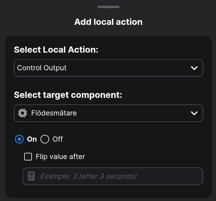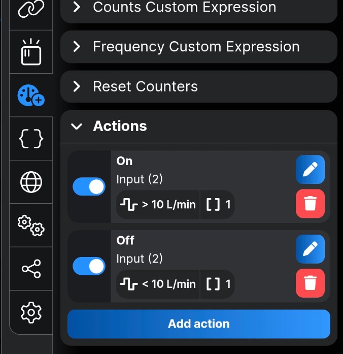 Tyvärr går inte lika enkelt att göra det för enheter anslutna till enheten via räknaringången, t.ex. en flödesmätare. Detta är rapporterat till Shelly och löses förhoppningsvis framöver. Men tills dess finns en smart lösning som gör att man kan få det att fungera i alla fall. Lösningen går ut på att man skapar lokala actions som sätter värdet på en av utgångarna beroende på om aktuellt flöde är större eller lägre än ett visst värde.