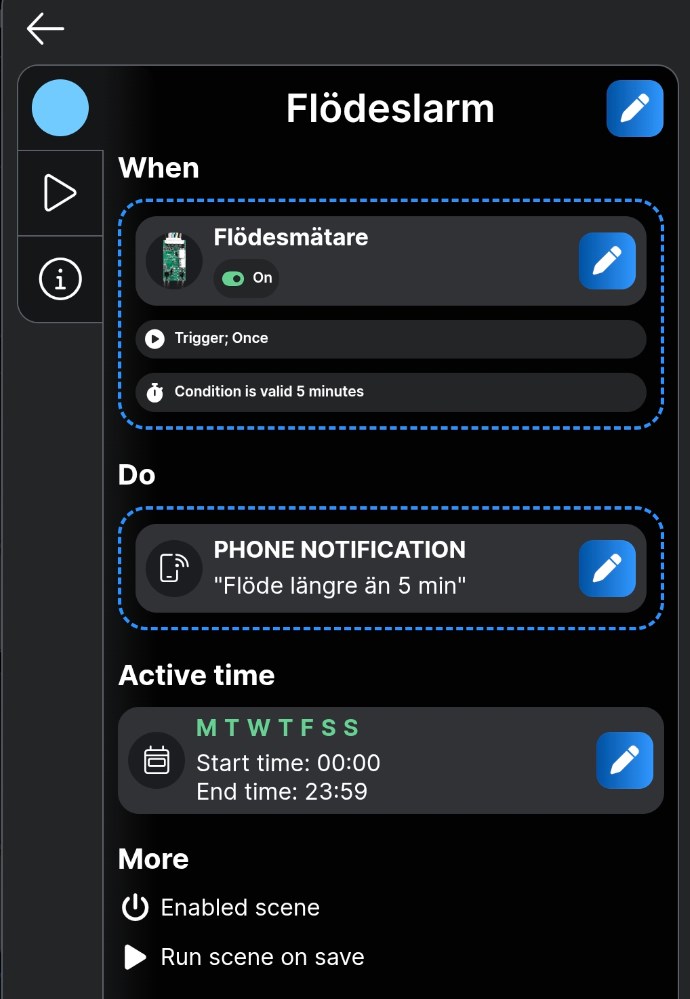 Sen kan man skapa en Scen som skickar en notifiering beroende på om utgången är hög under en viss tid.