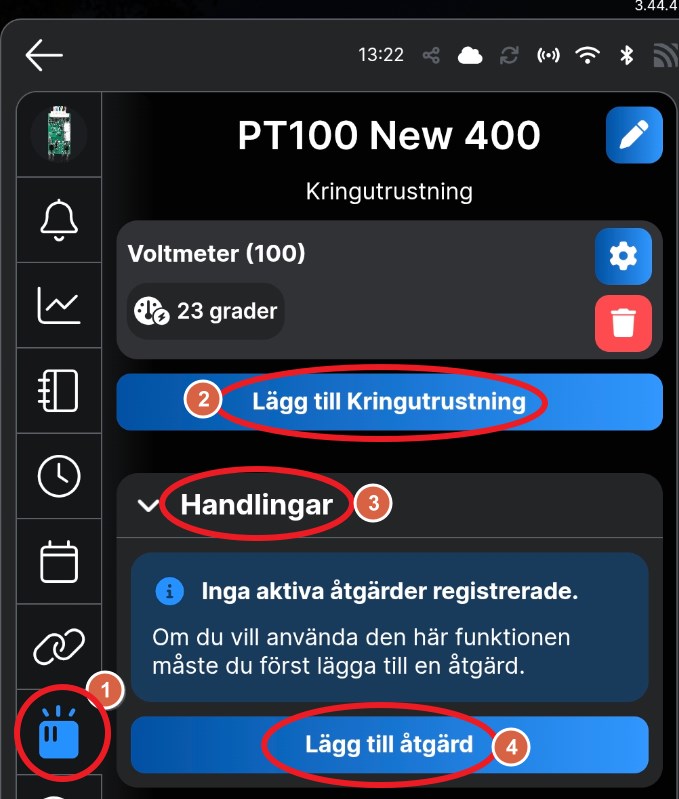 För att styra andra enheter utifrån värdet du får in från PT100 givaren använder du händelser knutna till din enhet. Du behöver skapa två olika händelser, en för att slå på och en för att slå av lasten vid olika temperaturer. Nedan visas hur man skapar händelsen för att slå på. Gör sedan samma igen för att skapa en händelse som slår av.