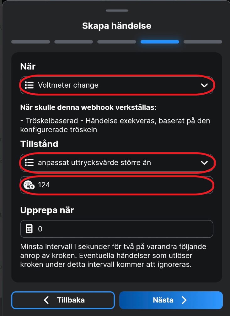 Välj sedan "voltmeter change" och "anpassat uttrycksvärde större/mindre än" samt vid vilken temperatur och klicka på nästa.