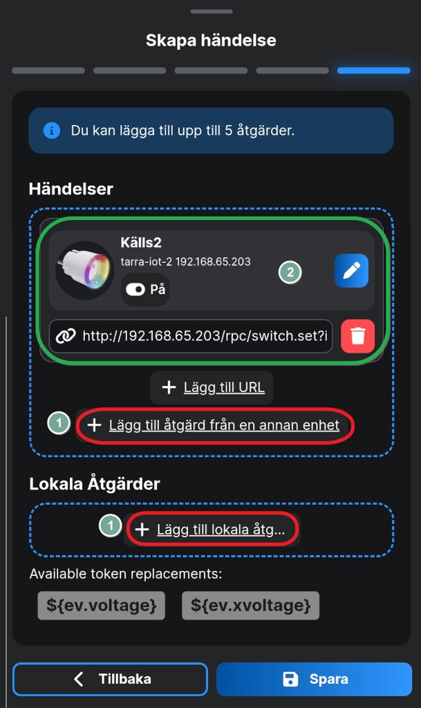 Välj sedan "Lägg til åtgärd från en annan enhet" om du vill styra en annan Shelly eller "Lägg till lokal åtgärd" om du vill styra utgångarna på samma enhet. Välj sedan rätt enhet och utgång samt om den ska slås på eller av. Du ska sedan se åtgärden liknande den i gröna markeringen. Då denna händelse kopplas till enhetens IP-adress rekommenderas att man reserverar den i routerns inställningar för att säkerställa att den inte ändras.