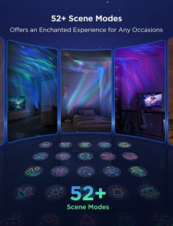 Projektorn erbjuder fascinerande norrskensbelysning idealisk för avkoppling och underhållning. Med sina mångsidiga funktioner passar den perfekt för olika situationer, från lugna kvällar till livliga fester. Med möjligheten att anpassa belysningen efter dina önskemål, blir denna projektor en mångsidig del av ditt smarta hem.