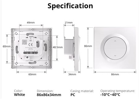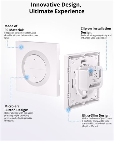 Med en högkvalitativ konstruktion av PC-material, är denna enhet både brandsäker och repfri, vilket säkerställer hållbarhet och långvarig användning. Dess tunna profil och micro-arc knapplayout förbättrar användarupplevelsen ytterligare genom att erbjuda exakt och lättanvänt taktilt feedback. Den är kompatibel med standard dosor och passar perfekt med Sonoff MINI-RBS och MINI-ZBRBS moduler.