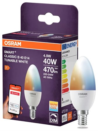 LED-lampan från OSRAM erbjuder både flexibilitet och stil i ljusform. Den är utformad för att passa i olika typer av ljuskronor och belysningsarmaturer. Med möjlighet att justera färgtemperaturen mellan 2700 och 6500 Kelvin kan du enkelt anpassa ljuset efter stämningen du önskar. ZigBee 3.0-kompatibiliteten ger smidig anslutning till smarta hem-system, medan app- och röststyrning möjliggör enkel kontroll över belysningen.