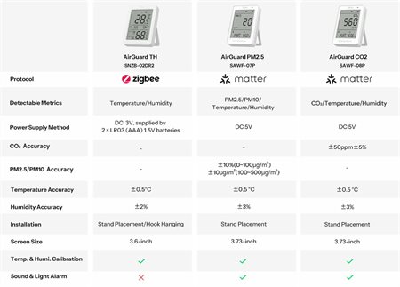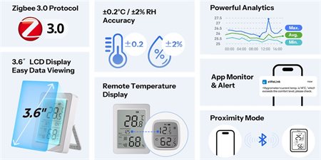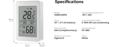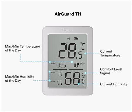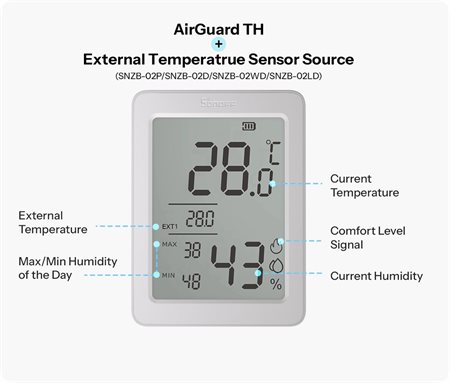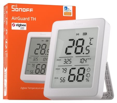 Sonoff AirGuard TH, är en Zigbee temperatur- och fuktsensor med en stor 3.6" LCD-skärm. Den är utformad för att ge precisa mätningar och ansluta via både Zigbee och Bluetooth, vilket möjliggör flexibilitet och noggrannhet i smarta hem-system.