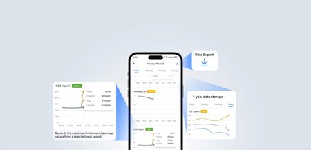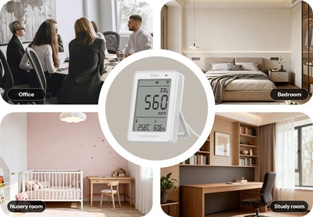 - Övervaka koldioxidnivåer, temperatur och luftfuktighet inomhus.