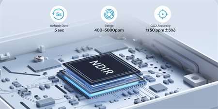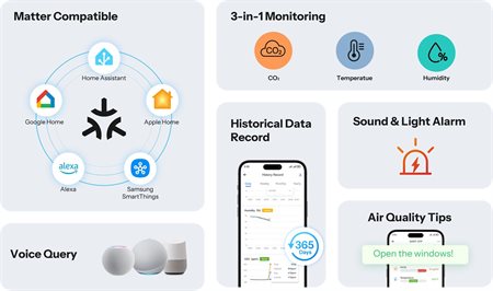 AirGuard CO2 är en avancerad luftkvalitetsmonitor med Matter over Wi-Fi, som övervakar och presenterar koldioxidnivåer, temperatur och luftfuktighet i realtid. Utrustad med hög precision NDIR-sensor, erbjuder den snabba uppdateringar och omfattande integreringsmöjligheter med smarta hem-system.