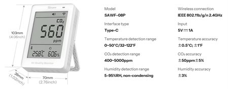 - Ljud- och ljuslarm: Flerfärgs-LED indikerar luftkvalitet.