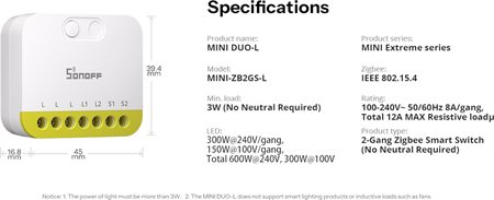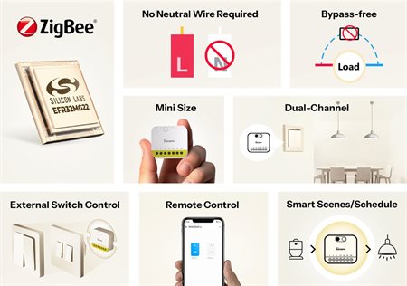 Kompakt Zigbee 3.0 switch med två kanaler som inte kräver nollledare. Den är designad för att enkelt passa in i standard väggdosor, vilket gör den idealisk för äldre installationer. Med stöd för upp till 12A total belastning, omvandlar den traditionella strömbrytare till smarta enheter med hjälp av en Zigbee-gateway.