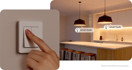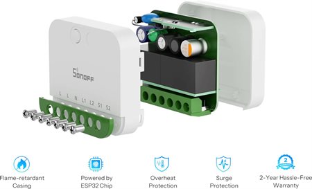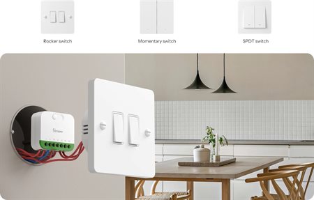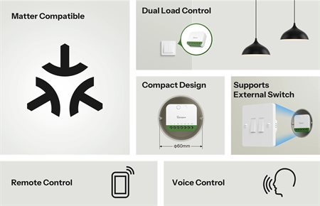 En ultrakompakt tvåkanals smart switch avsedd för infälld montering bakom befintliga väggströmbrytare. Tack vare sin lilla storlek ryms den i standardiserade kopplingsdosor och låter dig göra om vanliga strömbrytare till smarta – utan att byta ut befintlig front eller dra om kablar. Med stöd för Matter over WiFi integreras den sömlöst med de flesta stora smarta hem-ekosystem.